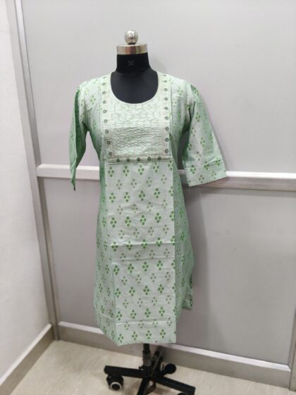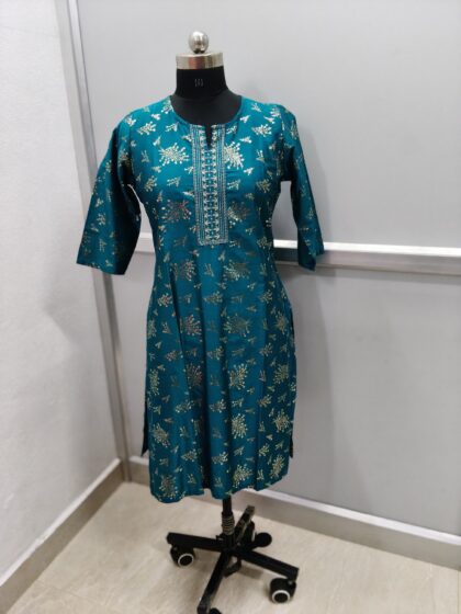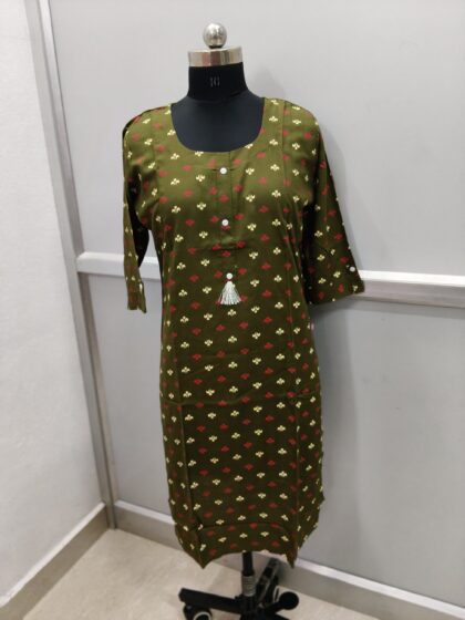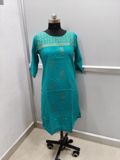 That is a lovely mustard yellow straight-cut kurti with a three-quarter sleeve and a V-neck, featuring maroon and gold embroidery around the yoke and small print/dots across the body.