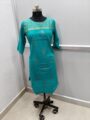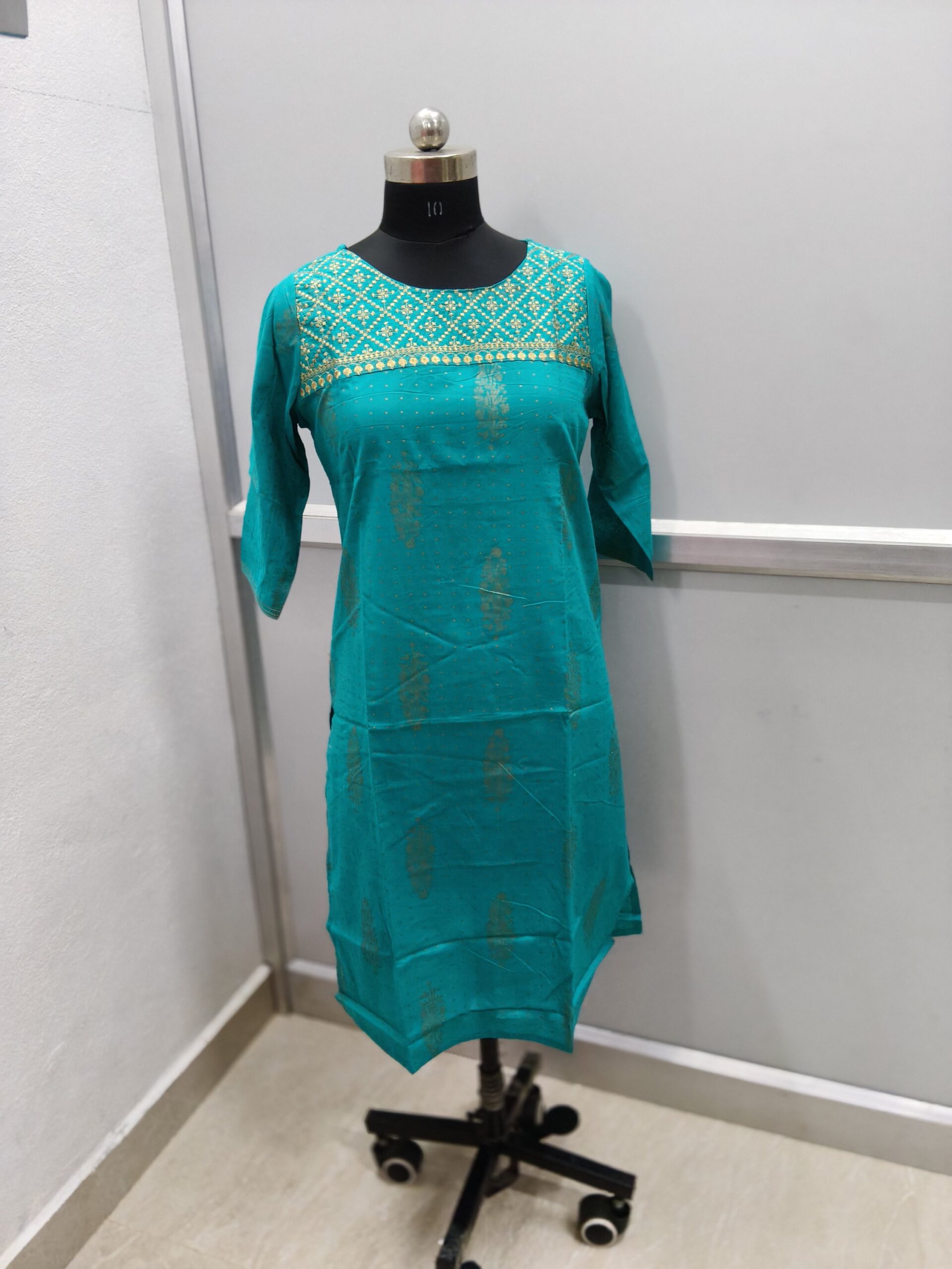 That is a beautiful Avaasa cotton kurti in a lovely shade of teal/turquoise with gold-toned embroidery/print detail on the yoke.