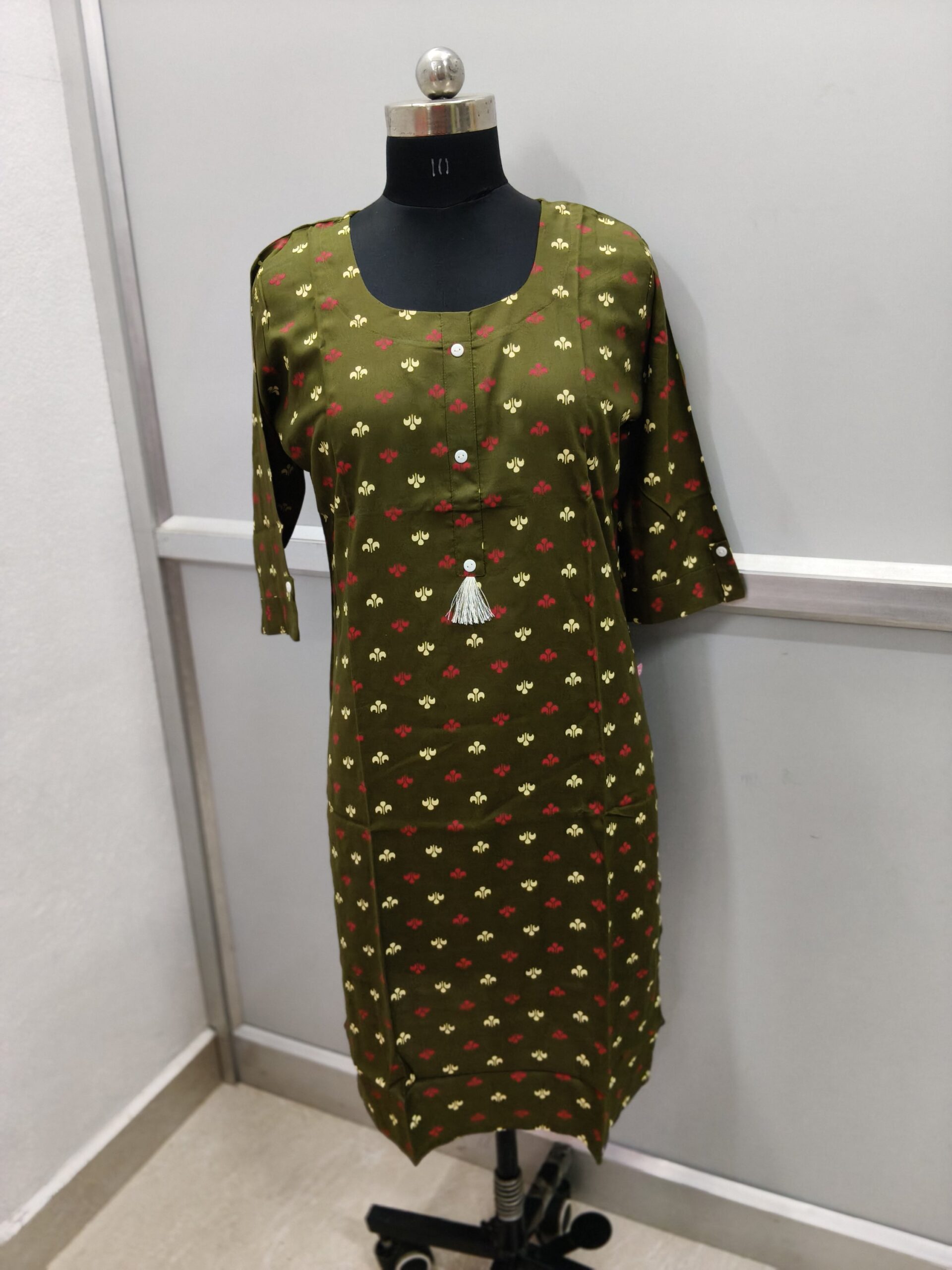 * Details: It features a round/scoop neck, 3/4 sleeves, and a small white tassel detail on the placket.