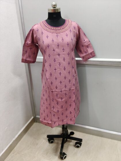 * Design: Features a detailed, geometric embroidered yoke in contrasting colors (looks like red/maroon and gold/off-white) and small repeating motifs all over the body. It has 3/4th sleeved