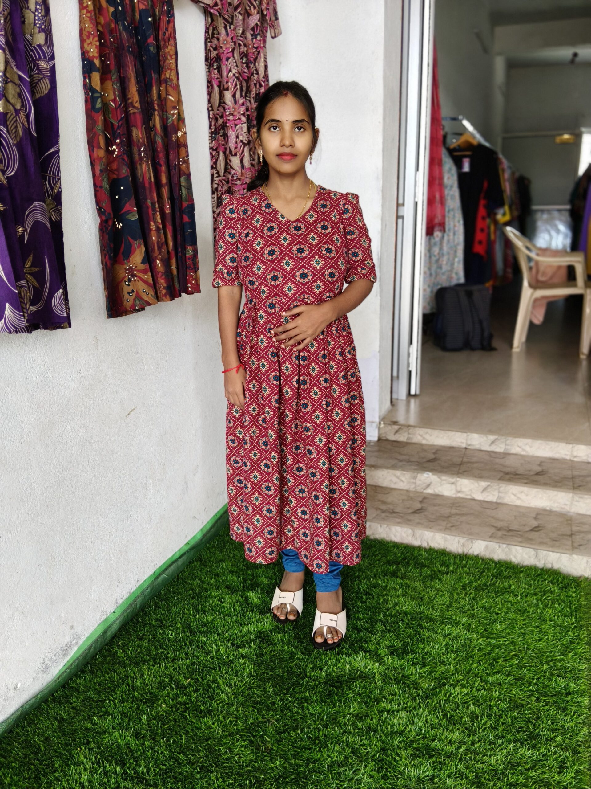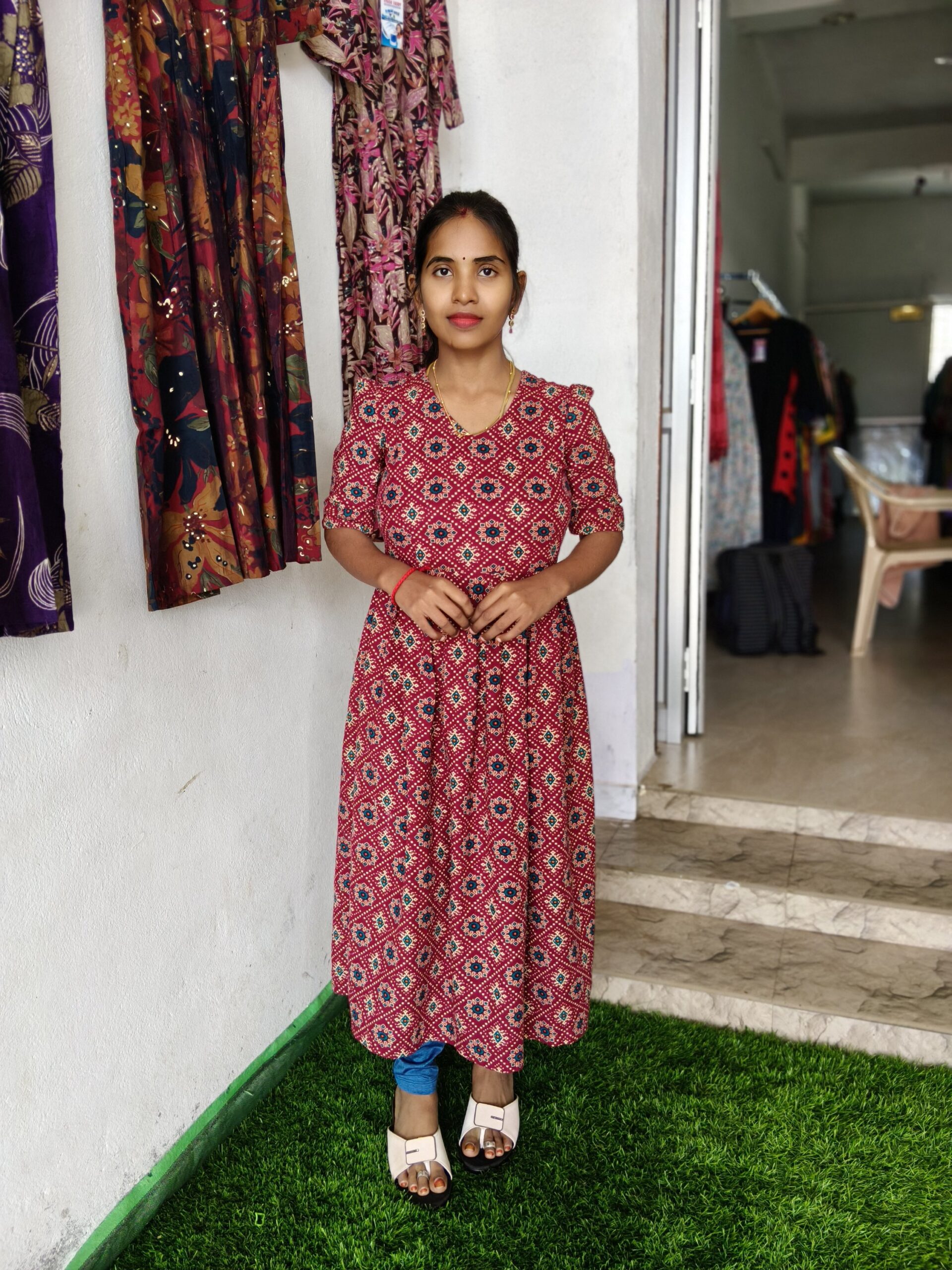 The dress style you’ve shown—a flowy, pleated, printed midi-dress—requires a cotton fabric that is lightweight, breathable, and drapes well. Pure cotton is a popular choice for everyday wear in India due to its comfort and breathability, especially in summer.