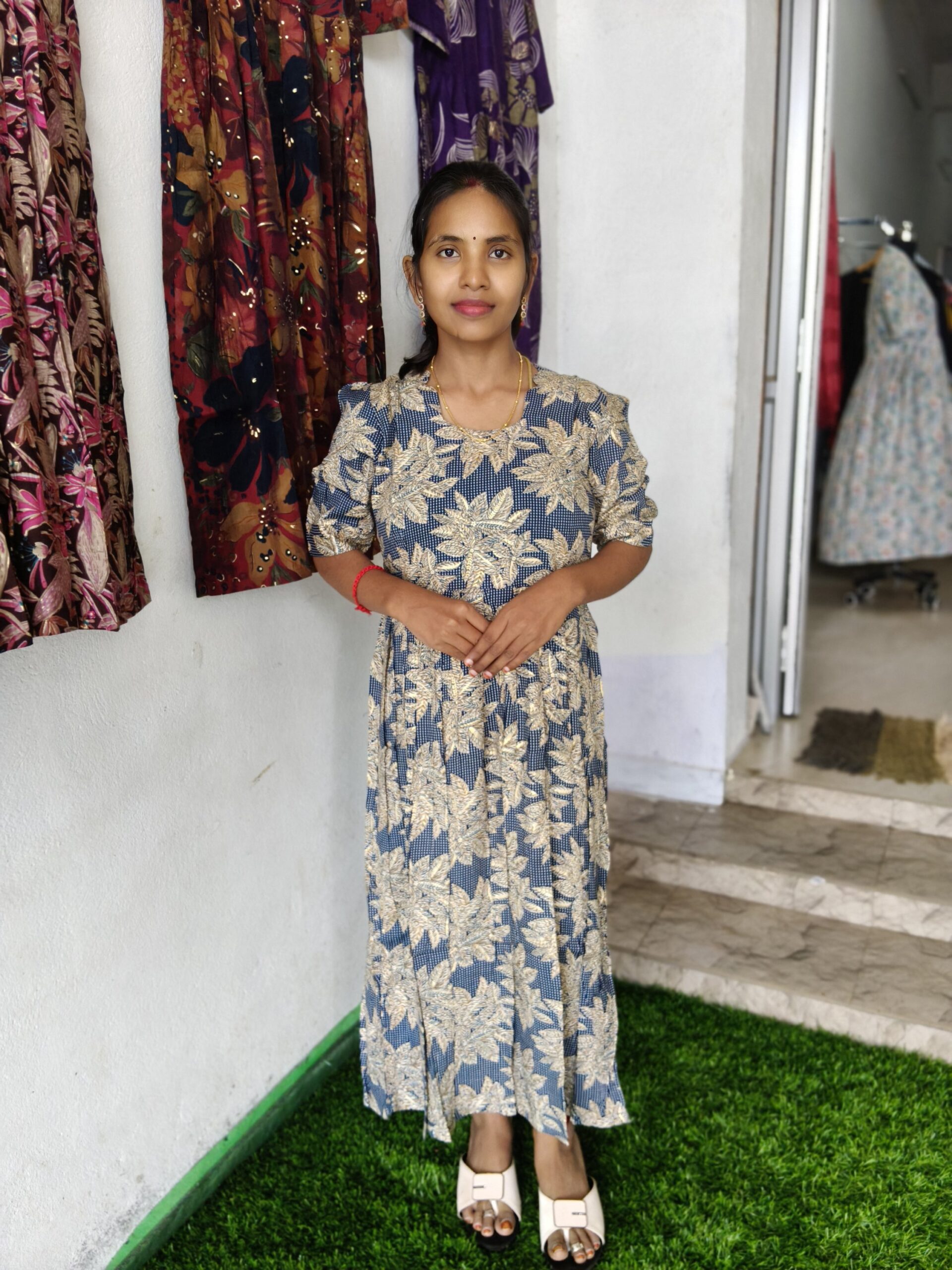 This dress appears to be a Foil Rayon Umbrella Maxi (also commonly called a full flair or Anarkali-style maxi dress).