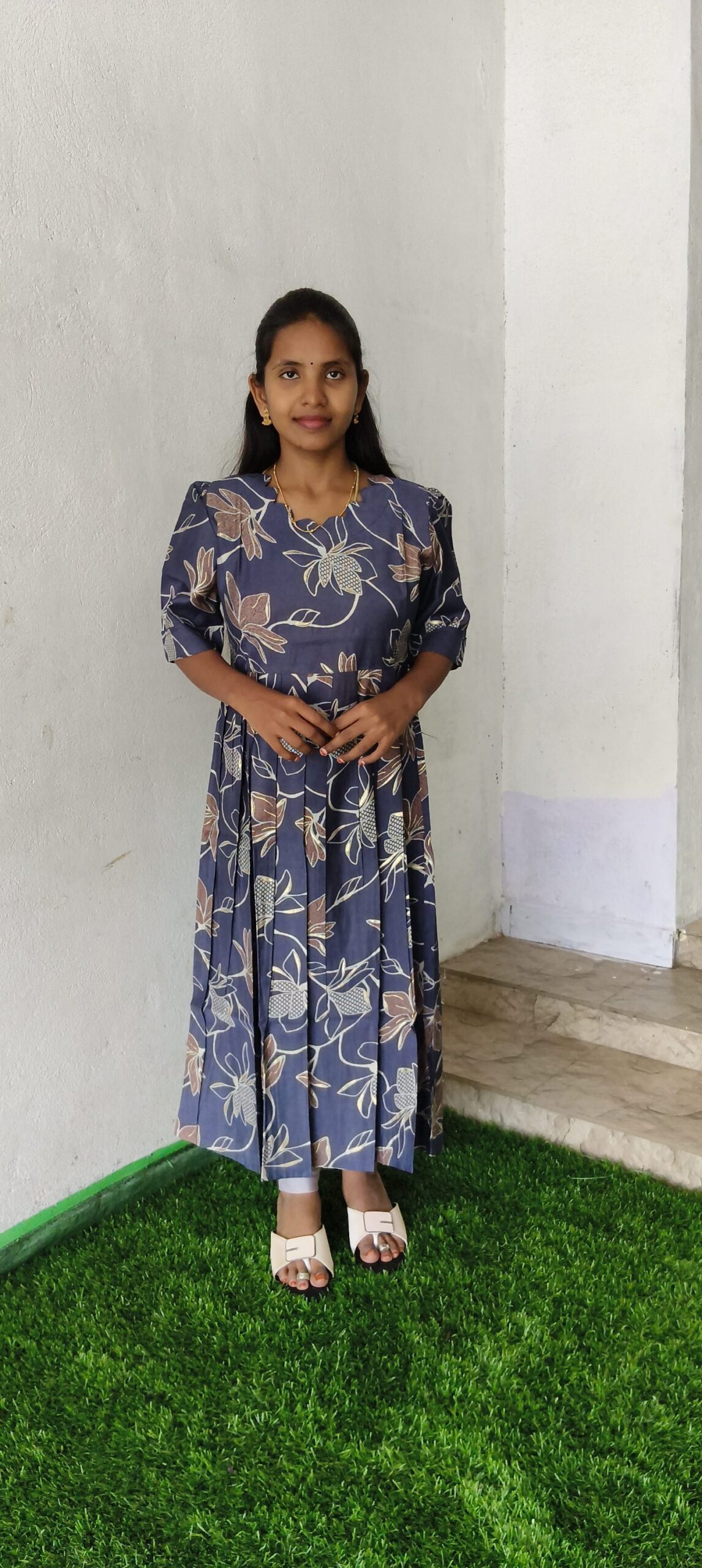 * Print: It takes prints well, which is why it is popular for printed garments like the floral dress you are wearing. The print in your photo is a detailed, all-over floral pattern on a blue/grey background.