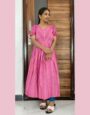 Experience comfort and style together with this beautifully designed Kathi Cotton Maxi Dress. Crafted through our own manufacturing, this maxi features soft breathable fabric suitable for all-day wear. The attractive pink striped pattern adds a fresh and youthful vibe, while the V-neck with pearl button detailing enhances elegance. Puff sleeves and flared design give a graceful, flowy look. Ideal for casual outings, home wear, or festive gatherings.